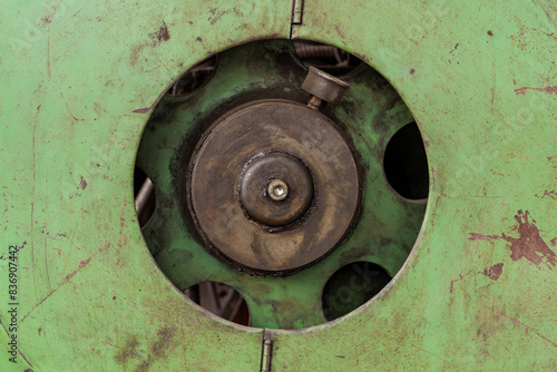 Detail of a worn, dirty and greasy industrial lathe machine.