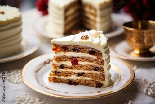detail of cold slices of christmas cake on a porcelain plate