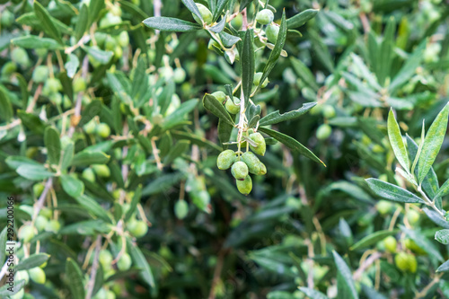 Detail of olive tree branch. Closeup of green olives fruits and leaves with selective focus and shallow depth of field, outdoors