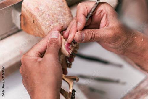 Detail of the hands of a dental technician fixing a dental prosthesis