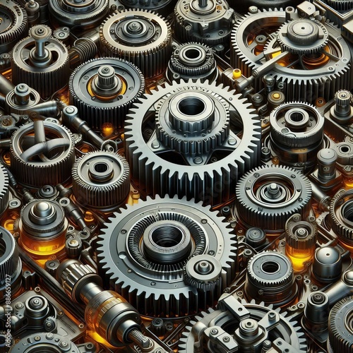 Detailed 3d background of futuristic mechanisms, gears with machine oil between them, wires, transparent tubes with colored liquid