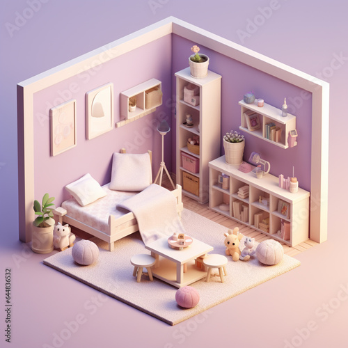 Detailed 3d render illustration of isometric block of Small Children's room interior. Generative Ai