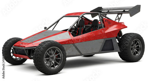 Detailed 3D Render of a Red and Gray Off Road Buggy with Black Wheels and Roll Cage on a White Background