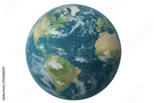 Detailed 3d rendering of rotating planet earth, showcasing north and south americas, partial african continent, atlantic ocean waters against transparent backdrop