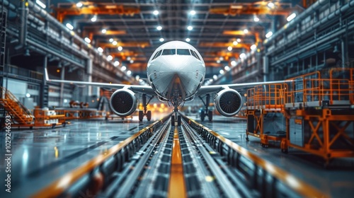 Detailed aerospace factory equipment conveyor belts and robotic systems assembling satellite parts ultra-high detail