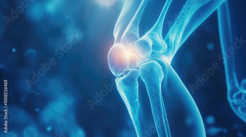 Detailed anatomical illustration of a human knee joint highlighting its structure and function in a vibrant blue tone.