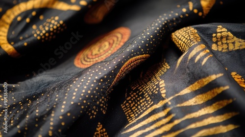 Detailed and dark-colored wax fabric with tribal patterns, showing off its elegant design