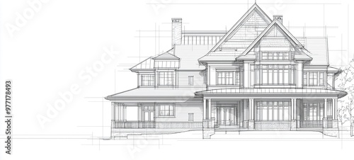 Detailed architectural blueprint sketch of a luxurious classic mansion with intricate exterior