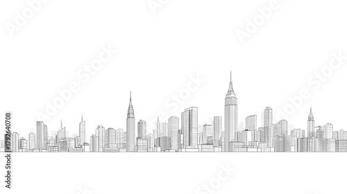 Detailed architectural sketch showcasing a dense urban skyline composed of various modern highrise buildings rendered in black lines on a clean white backdrop