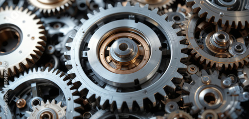 Detailed arrangement of metallic gears showcases their complex design and interlocking mechanisms often found in machinery. This display emphasizes engineering precision