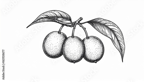 Detailed Black and White Drawing of Three Cherries with Leaves Isolated on White