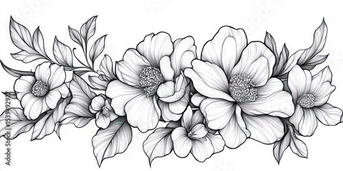 Detailed black and white line art of a horizontal floral arrangement with large blooming flowers and leaves intricate shading and delicate texture
