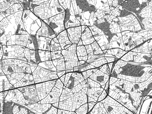 Detailed black and white map of Essen, Germany, in artistic sketch style.