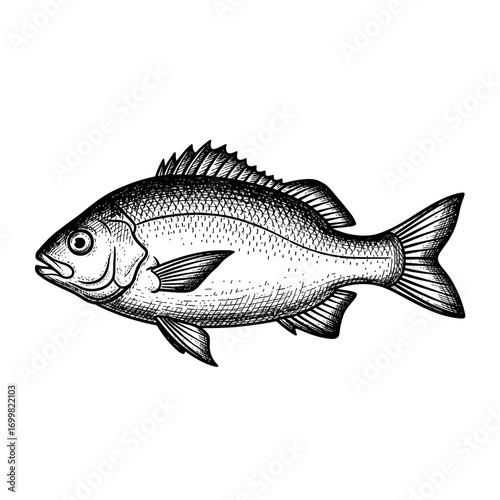 Detailed black and white silhouette of a fish with textured scales and fins transparent background