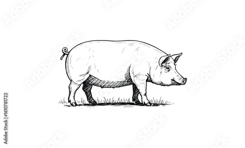 Detailed black and white sketch of a standing pig on grass. Vector retro hand drawn illustration