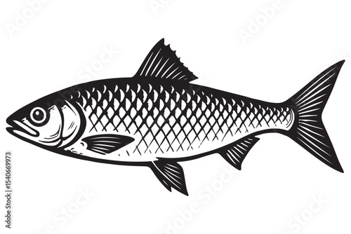 Detailed black fish silhouette drawing with sharp fins and scales for a clean look