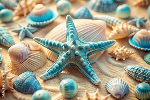 Detailed Blue Ocean Shells & Starfish on Light Background - Marine Life Stock Photo