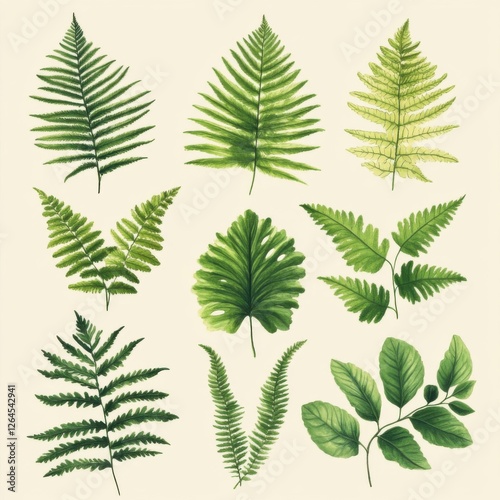 Detailed Botanical Illustration of Various Ferns and Leaves