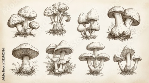 Detailed botanical illustration of various mushroom species growing in clusters and individually, with a vintage aesthetic.
