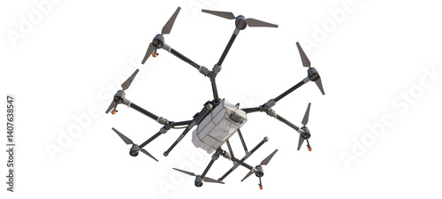 Detailed bottom view of a drone for farming applications. Agricultural technology. Isolated on a transparent background. 3D illustration.