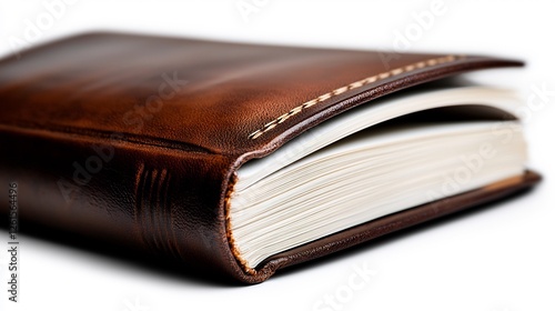 Detailed Brown Leather Book with Yellowed Pages Opened on White Background