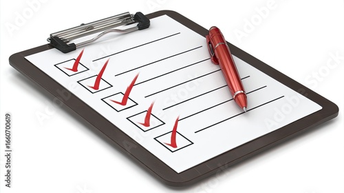 Detailed Checklist On Clipboard With Red Pen A Comprehensive Productivity And Organization Image Showing A Dark Brown Clipboard With A White Paper