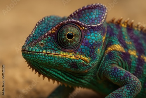 Detailed close up of a chameleon head with vibrant green, purple, and gold scales