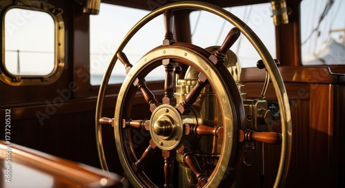 Detailed close up of an antique brass ship steering wheel with weathered patina and intricate wood grain