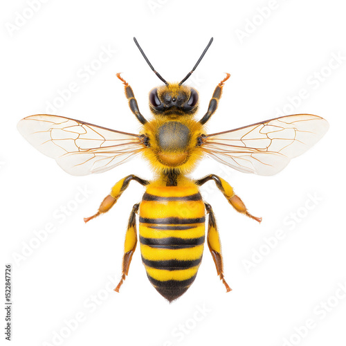 Detailed close up of bee with vibrant yellow and black stripes, showcasing its delicate wings and intricate body structure. image highlights bee natural beauty and symmetry