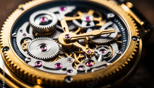 detailed close up of luxury mechanical watch showcasing intricate gears and jewels