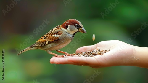Detailed close up of sparrow feeding on grains on human palm, focusing on pecking activity