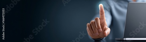 Detailed close up view of individual hand with single finger pointing and touching the screen of modern sleek laptop computer illustrating moment of interaction.