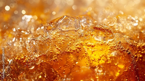 Detailed close-up of a fizzy drink with ice cubes, emphasizing the sparkling bubbles and warm amber tones. Perfect for beverage ads and promotional materials.