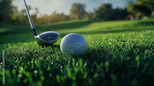 Detailed close-up of a golf ball on a tee with a classic golf driver and vibrant green grass, creating a picturesque golf course scene