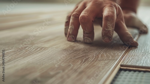 Detailed close-up of a hand installing laminate timber flooring, construction worker, home renovation, rich textures, precision and care