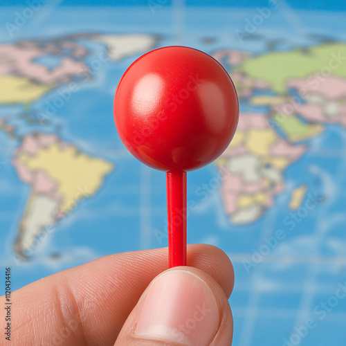 Detailed close-up of a human hand placing a red pushpin on a world map, with the pushpin as the vibrant focal point