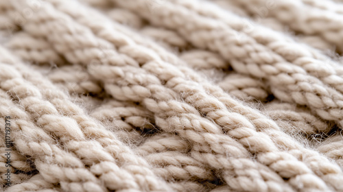 Detailed close-up of a knitted wool texture in warm beige and gray tones