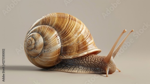 Detailed close-up of a realistic snail showcasing its patterned shell in shades of brown and cream, with extended antennae against a neutral background.