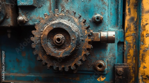 Detailed close-up of a rusty gear from an old milling machine, featuring textured metal surfaces and a blue and yellow backdrop, industrial machinery, workshop, vintage equipment.