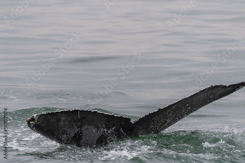 Detailed close-up of a the tail fin of a diving whale. Walvis Bay, Namibia.