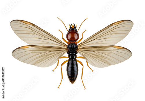 Detailed Close-Up of a Winged Termite Isolated on White Background, Showing Intricate Details of its Body and Wings