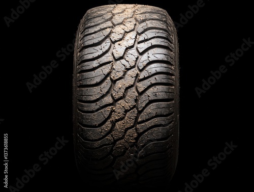 Detailed Close-Up of a Worn Tire with Mud and Dirt Accumulation