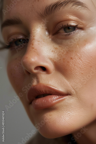 Detailed Close-Up of a Young Woman in Her 30s with Glowing, Healthy Skin, Without Makeup