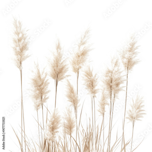 Detailed close-up of beige pampas grass plumes with stems, showcasing the delicate texture and fluffy appearance, isolated on transparent background