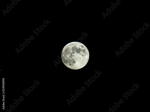 Detailed close-up of full moon against black sky. Sharp view on Tycho and Copernicus Craters. Good visibility of Sea of Serenity and Sea of Tranquillity.