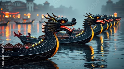 Detailed close-up of intricately decorated dragon boat heads showcasing vibrant colors and fierce expressions during the Dragon Boat Festival on serene water