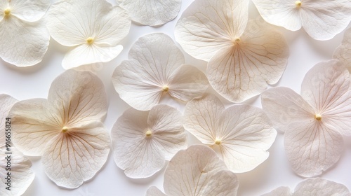Detailed close-up of pressed hydrangea petals against a white background, with fine textures visible