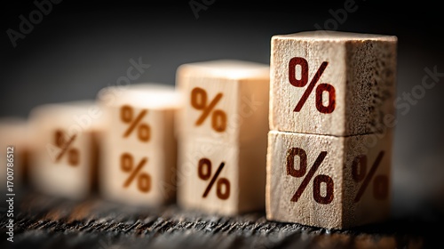 Detailed Closeup of Stacked Wooden Blocks Displaying Percentage Signs, Ideal for Creative and Business Projects Boosts Innovation and Productivity.