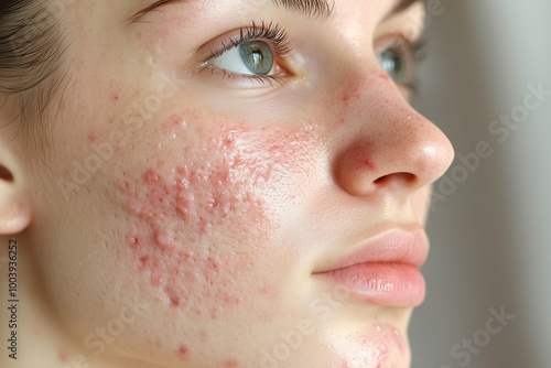 Detailed close-up of young woman face with acne scars and blemishes highlighting real-life beauty and skin texture. Skincare awareness concept