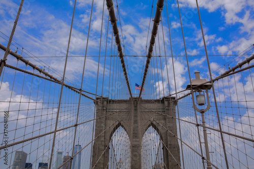 Detailed, closeup perspective of Brooklyn Bridge in New York state